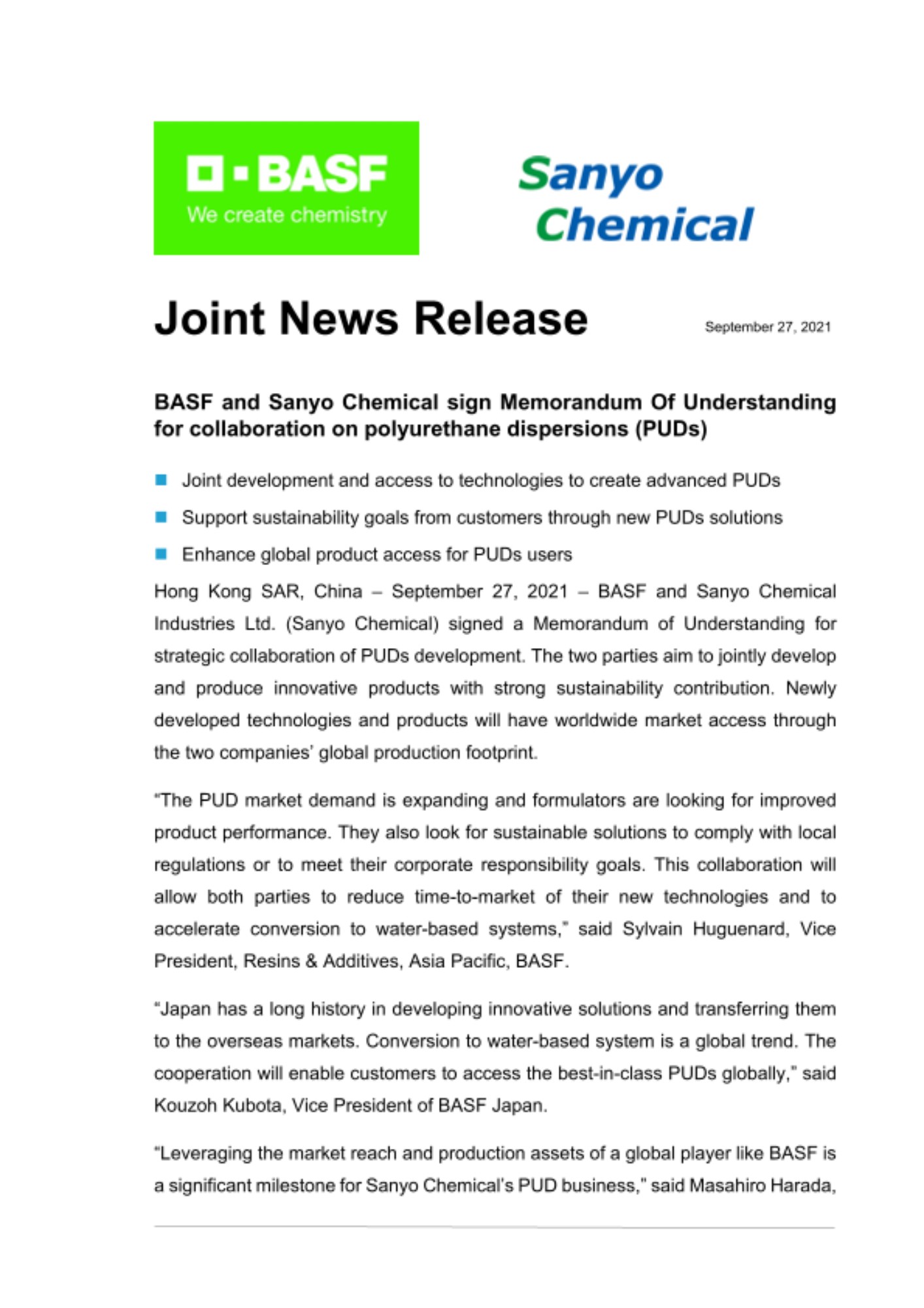 BASF and Sanyo Chemical sign Memorandum Of Understanding for collaboration on polyurethane dispersions (PUDs)