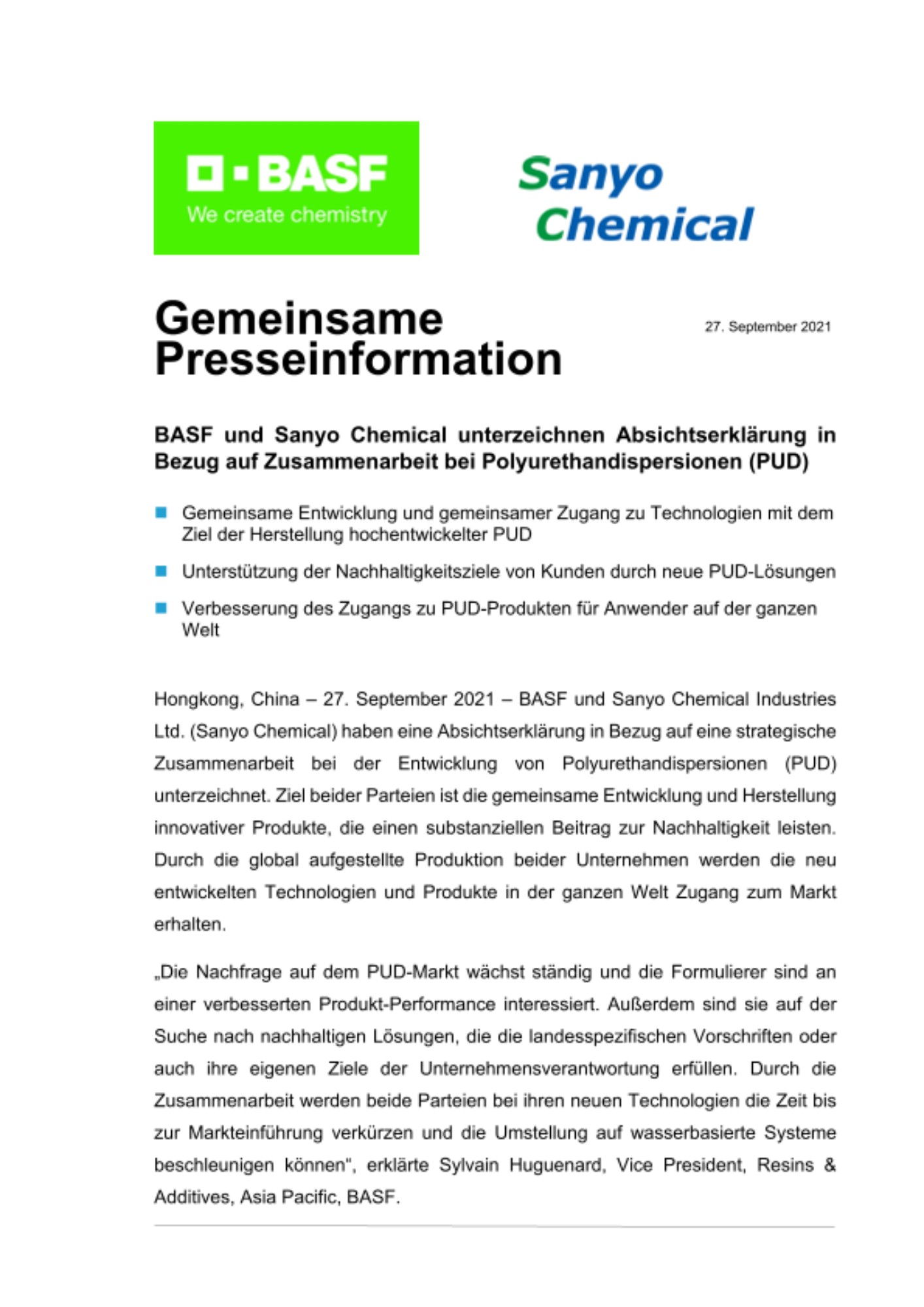 The MOU enables the strategic collaboration of BASF and Sanyo Chemical. It enhances joint development and allows the two companies to leverage on the production networks for PUDs. The cooperation provides flexibility and reliability to customers while enabling a lower carbon footprint throughout the value chain.
