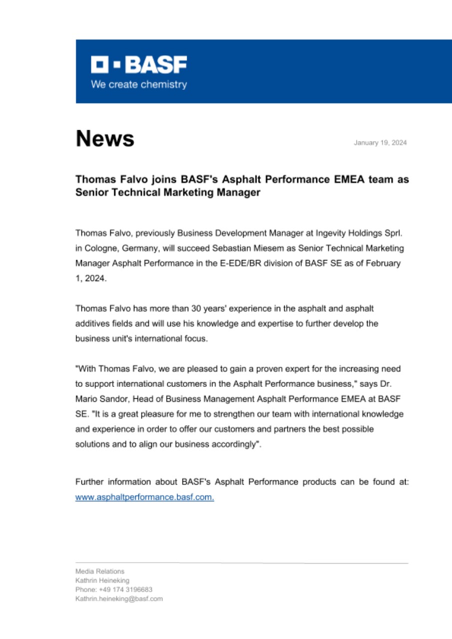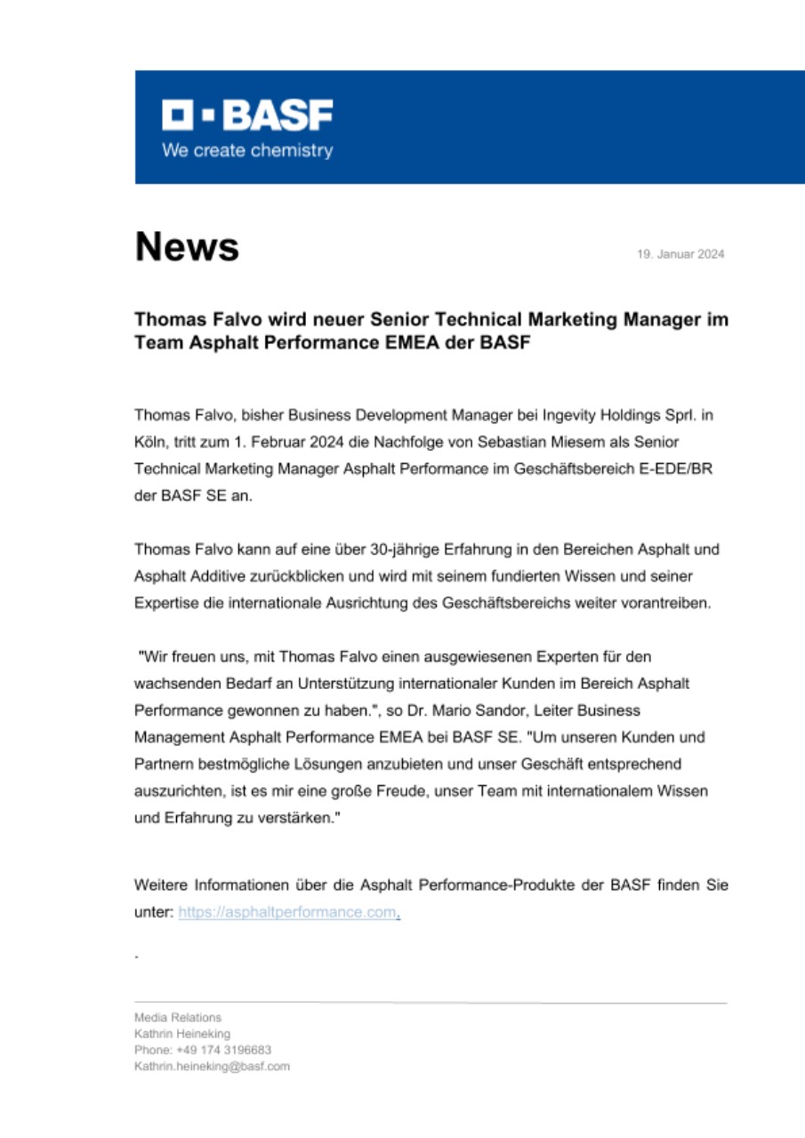 "With Thomas Falvo, we are pleased to gain a proven expert for the increasing need to support international customers in the Asphalt Performance business," says Dr. Mario Sandor, Head of Business Management Asphalt Performance EMEA at BASF SE. "It is a great pleasure for me to strengthen our team with international knowledge and experience in order to offer our customers and partners the best possible solutions and to align our business accordingly".